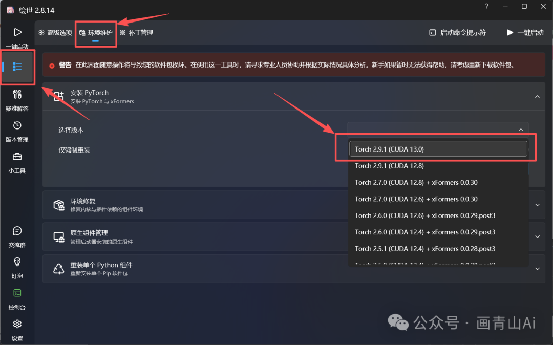 如果你的pytorch版本过低,可以到绘世启动器的“高级选项”界面下“环境维护”页面进行安装,方式如下图所示: